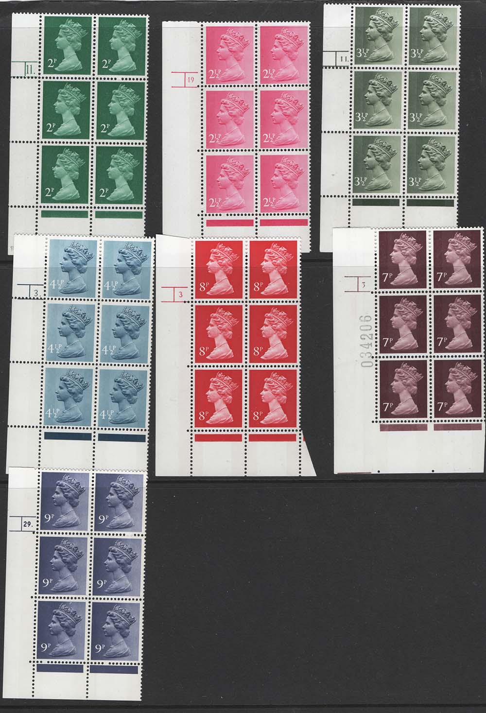 GB 1971 Machin 2B PVAD p17 um cyls: 2p 11., 2½p 19., 3½p 11., 4½p 3., 8p 3 p17 almost missing & ragged phos band edge and EEH, them 7p cyl 3 p26, 9p 29. p30