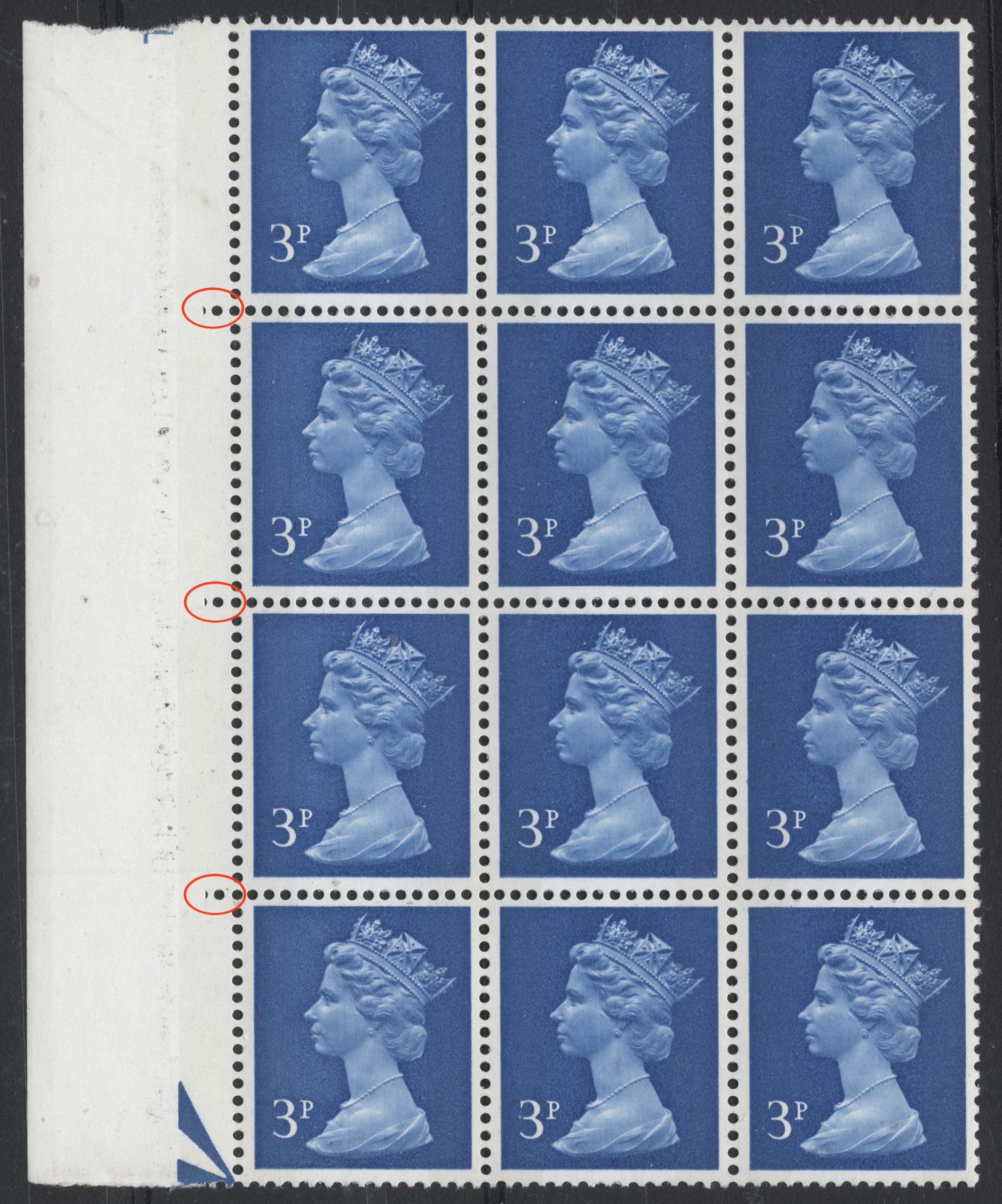 GB 1971 Machin 3p 2B FCP/GA um blk of 12 with 1¼ extension perfs, each has a small segment of a second perf hole visible.