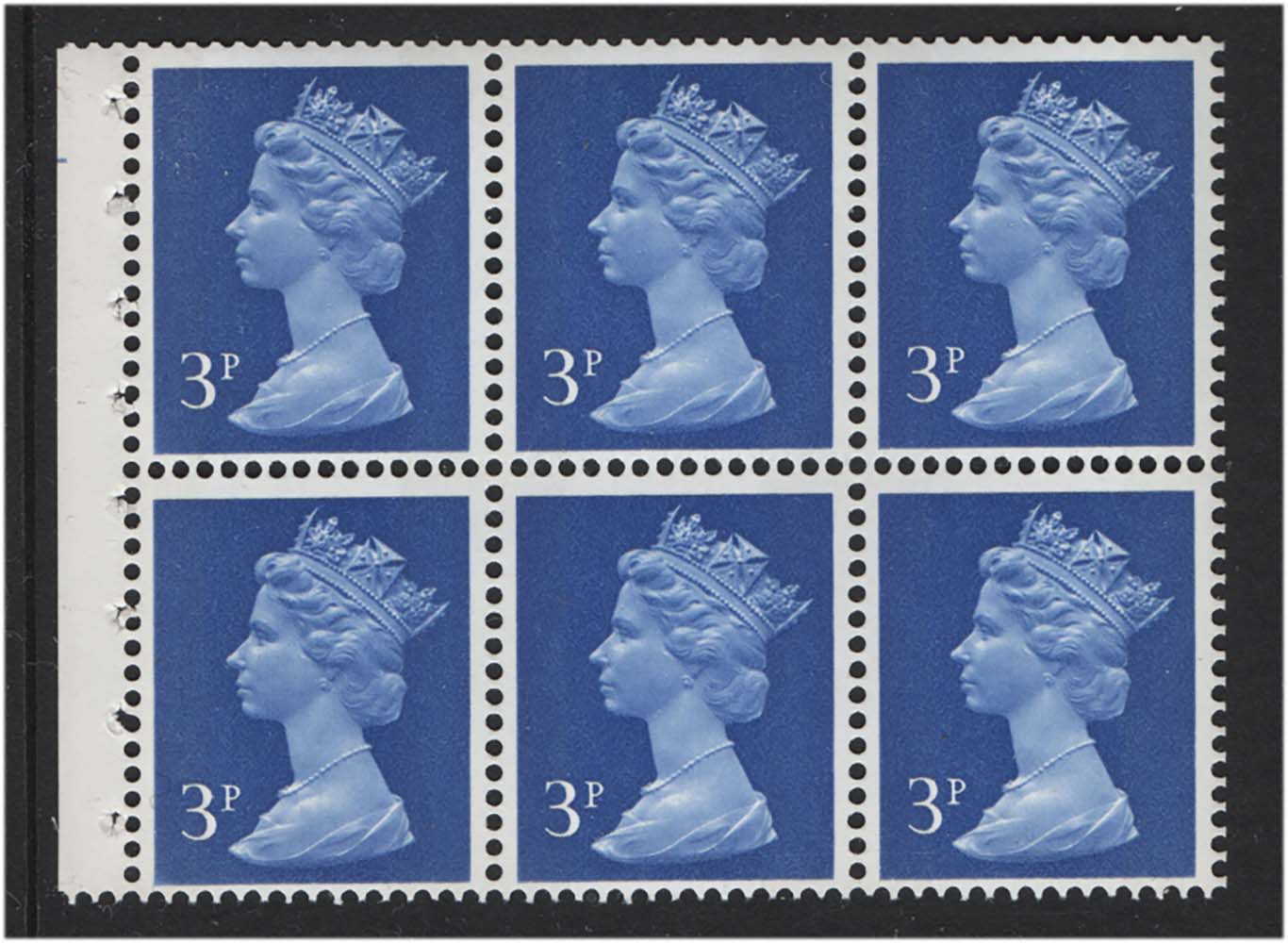 GB 1971 Machin 3p FCP/PVA cyl B28 booklet pane of 6 (box tips) full perfs um c£32 [ref 287bb1422/s/9s0042]