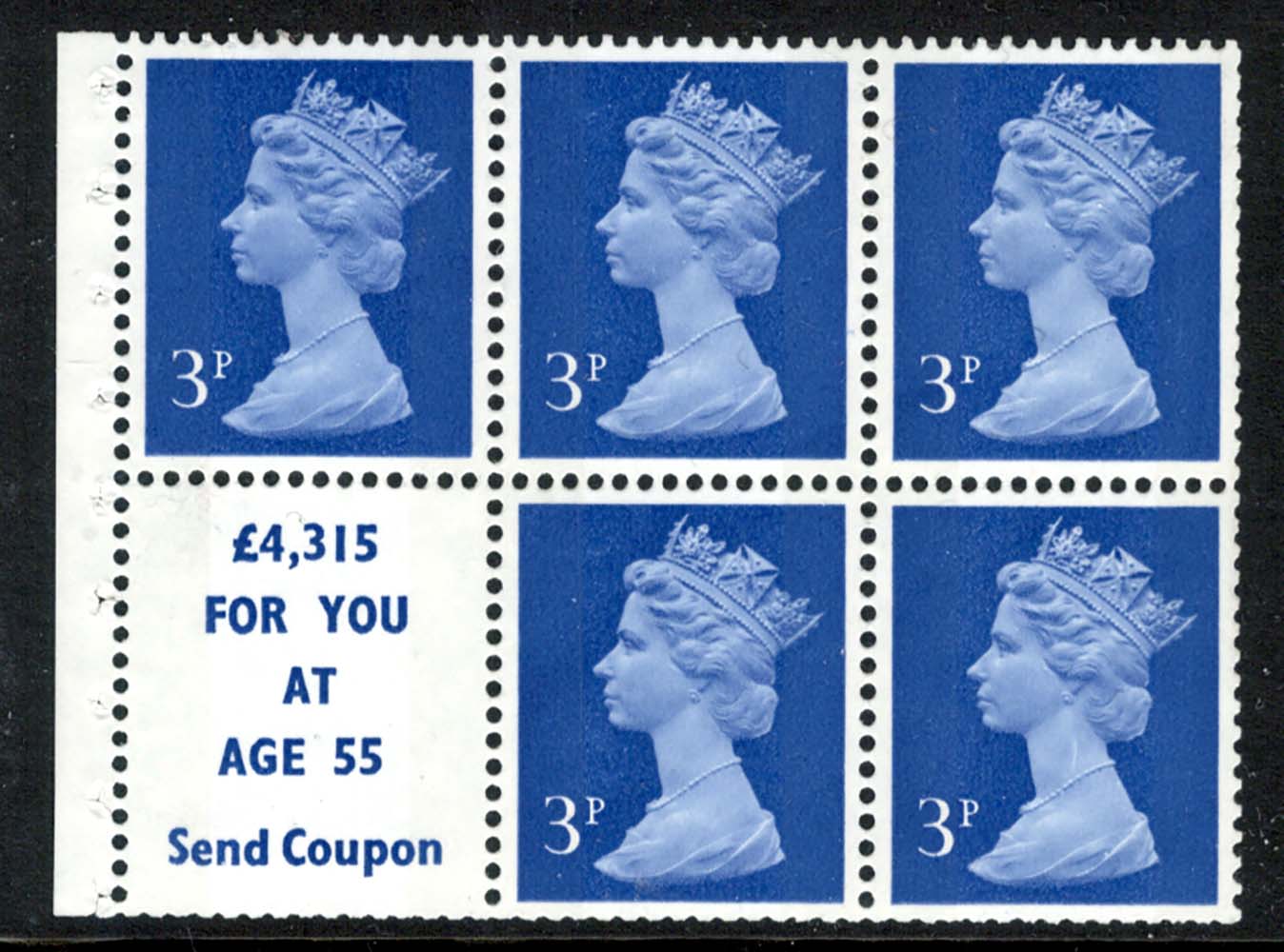 GB 1971 Machin 3p OCP/PVA booklet pane of 5 + label, the scarce I-perf selvedge, fair perfs um [ref ebay/1190-a33 e4074] 291/#680