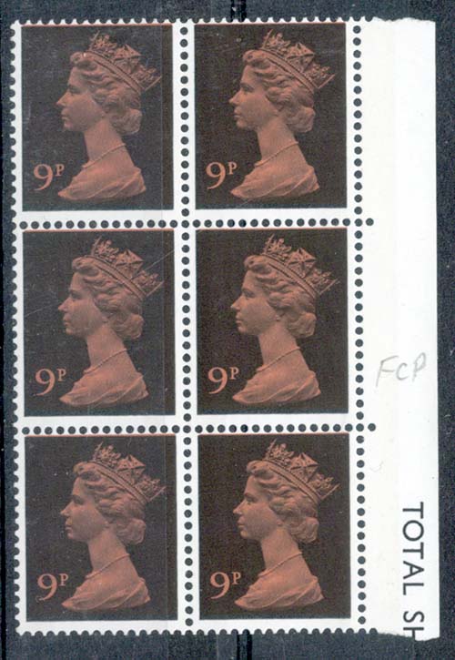 GB 1971 Machin 9p FCP/PVA colour shift, orange protruding at top um marginal blk of 6