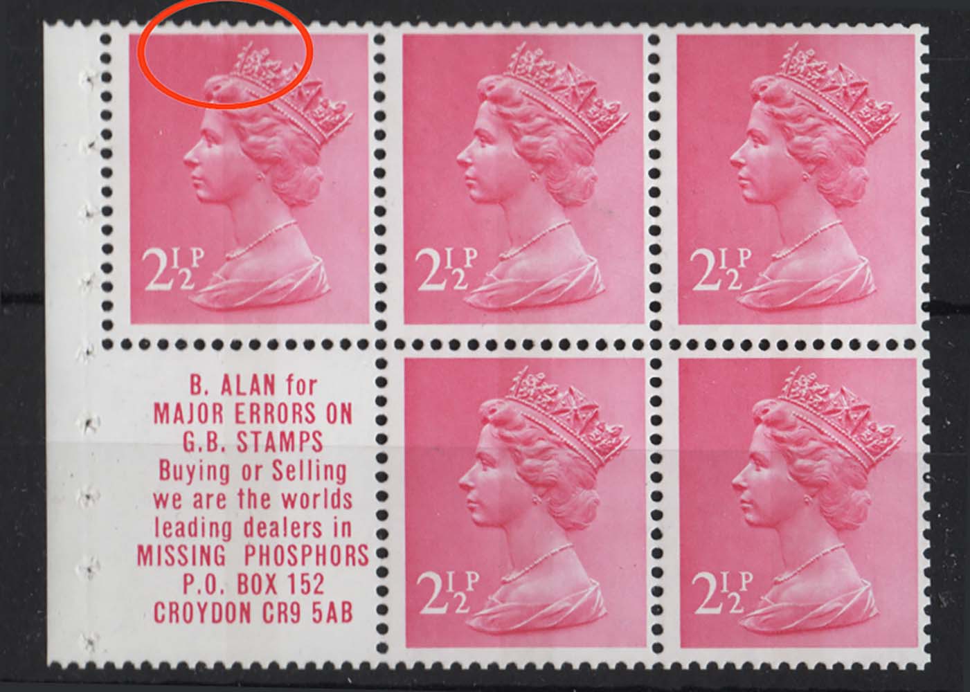 GB 1971 Machin FCP/PVA 2½p B Alan pane #1 large disturbance top frame variety good perfs um BmkV4 [ref 287bb1430/sa/9q0570]