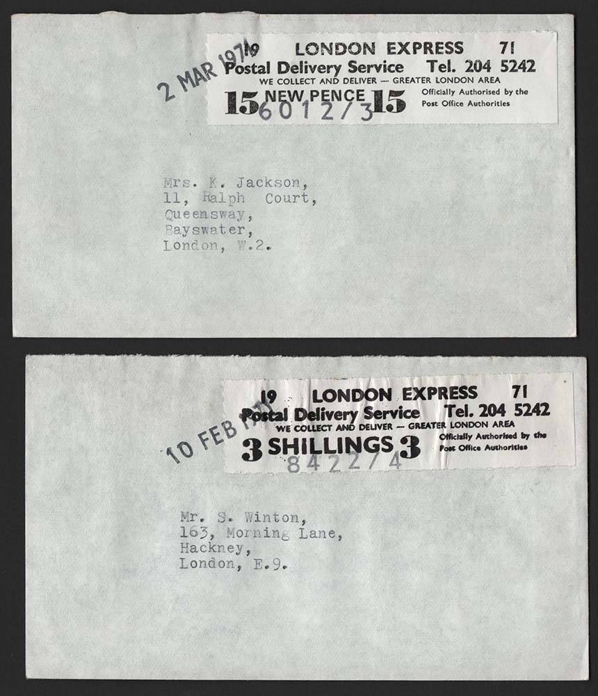 Strike Mail: London Express Delivery 3s stamp on cover, ditto with 15p
