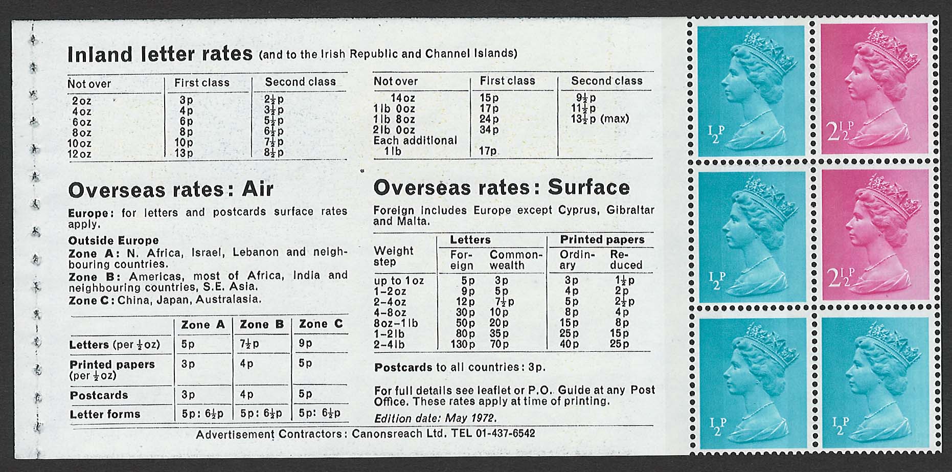 GB 1972 Machin ½p sideband um in complete booklet pane with good perfs all round ‡ [ref 2741997/se/7w0194]