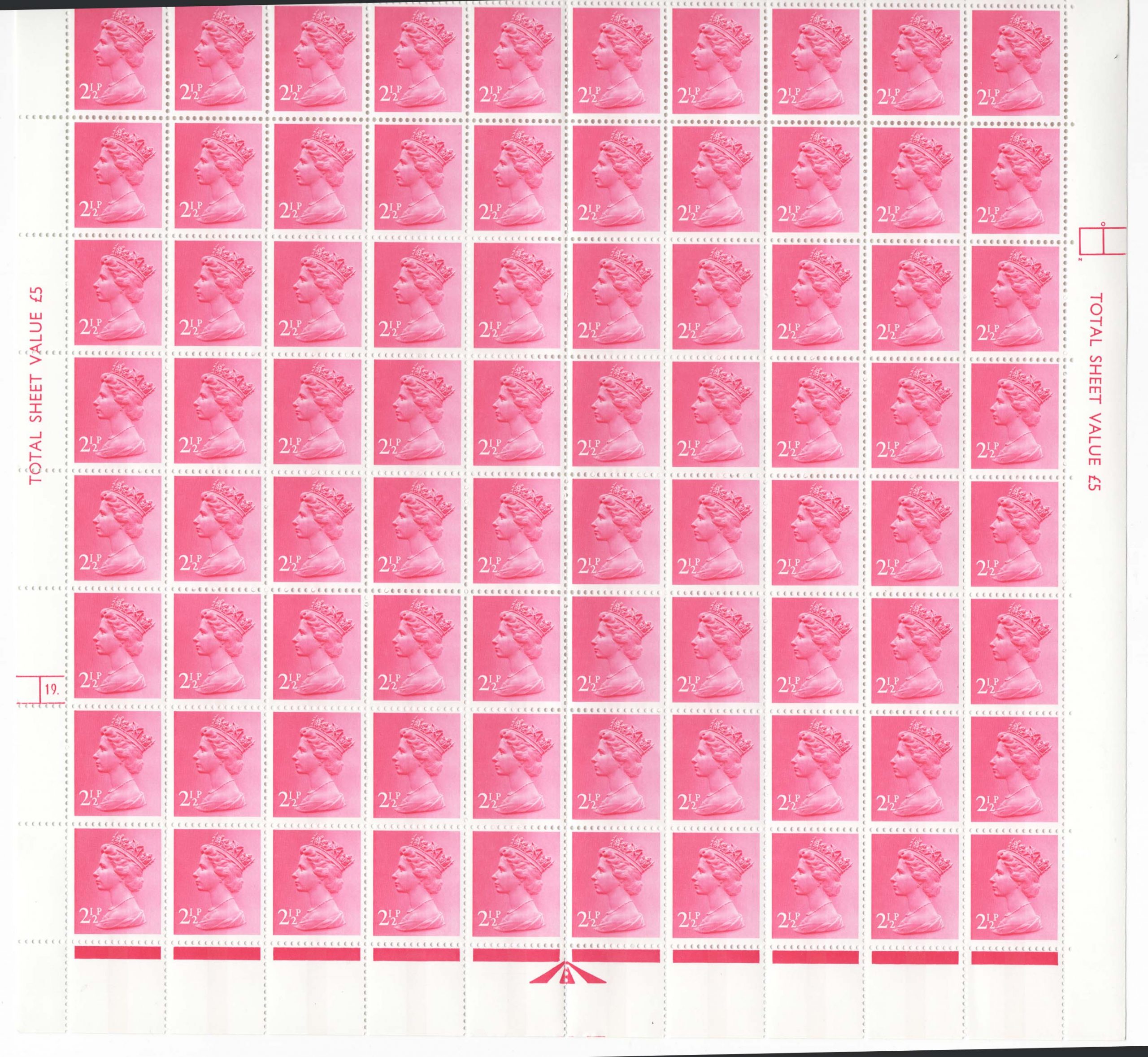 GB 1975 Machin 2½p CB PVAD type II um cyl 19 dot lower ½-sheet of 100 incl the SG-listed varieties r20/10 broken necklace etc [ref 287bb1480/l/9q0656]