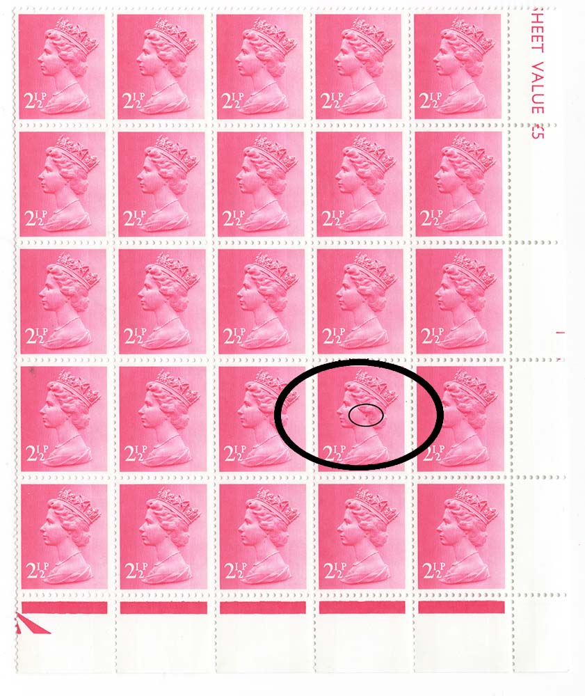 GB 1975 Machin 2½p 2B PVAD r19/9 extra earring variety um corner blk of 25 (a few marks on gum on top 3 rows but you can take those off if they offend)