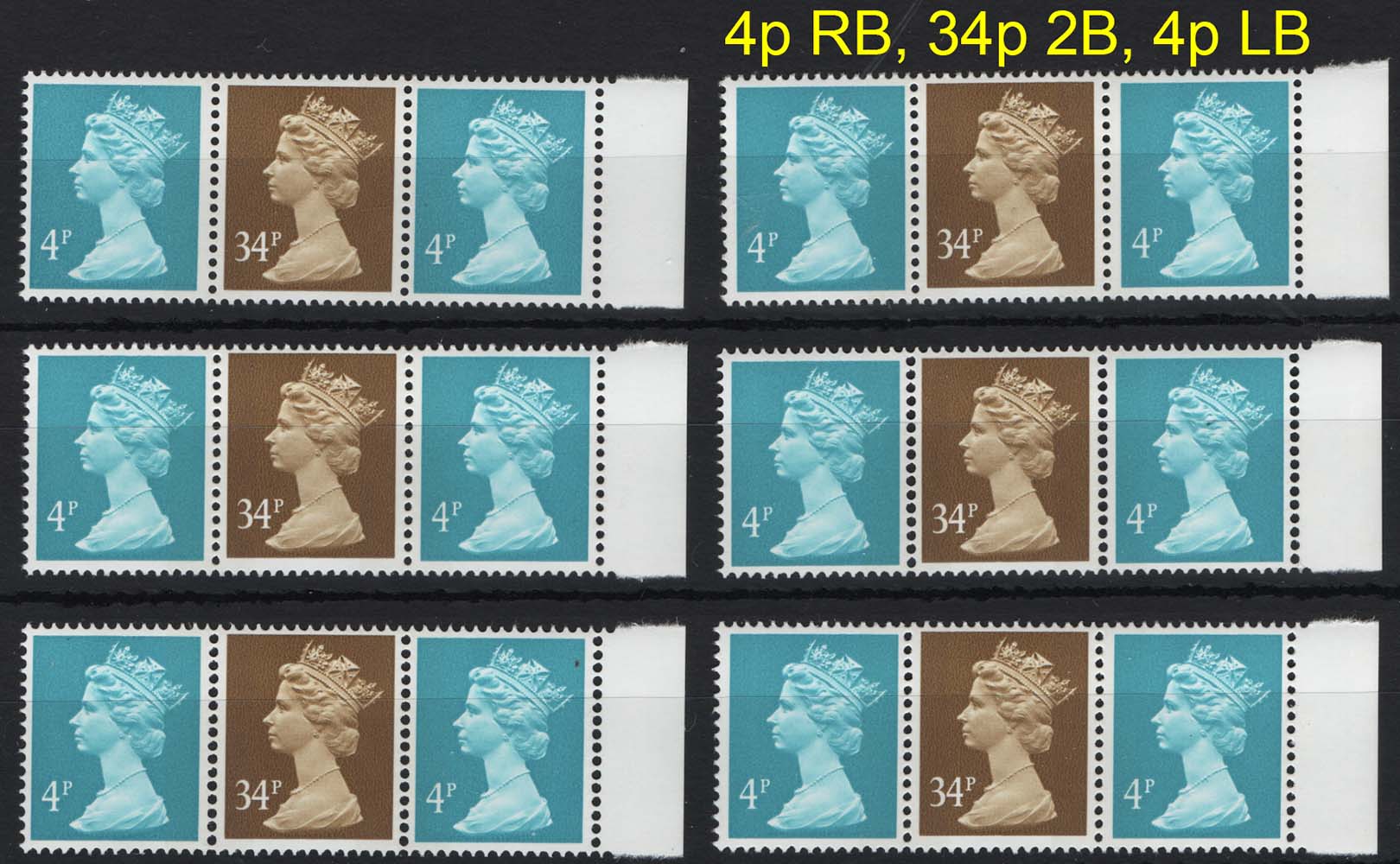 GB 1985 Machin 34p ochre 2B & 4p blue left band + right band unmounted mint sgX920, 864, 864a – 6x fine unmounted mint examples of each cat £79+ [ref 288/sa/9w0173] Elizabeth II