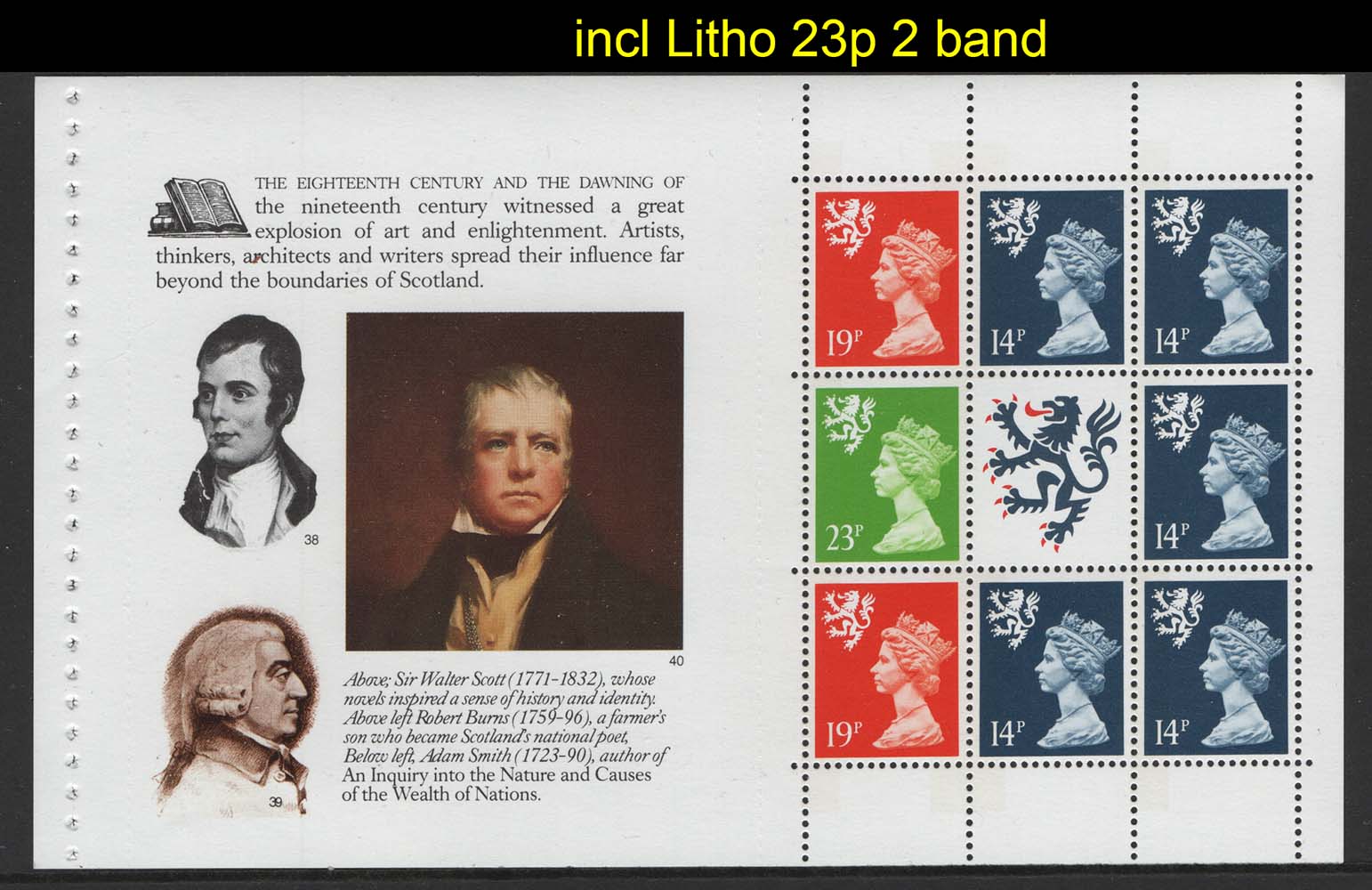 GB 1989 Those difficult Litho Scottish Regional Machins um: 23p green 2B, 19p 2B, 14p LB + others in complete booklet pane s.gS68, etc
