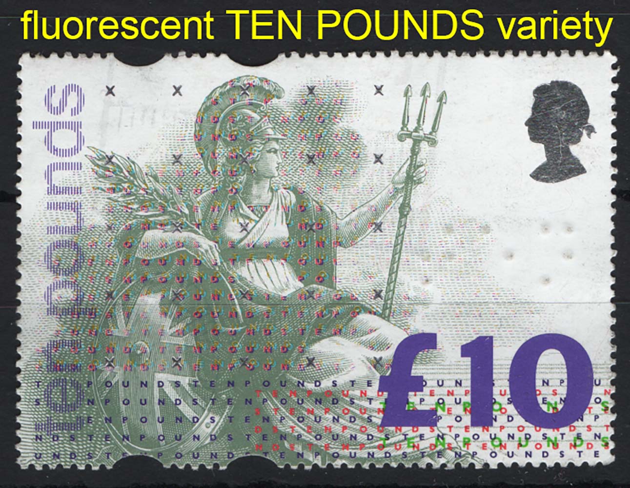GB 1993 £10 Britannia, the fluorescent TEN POUNDS variety fu, shows only under LONG wave UV