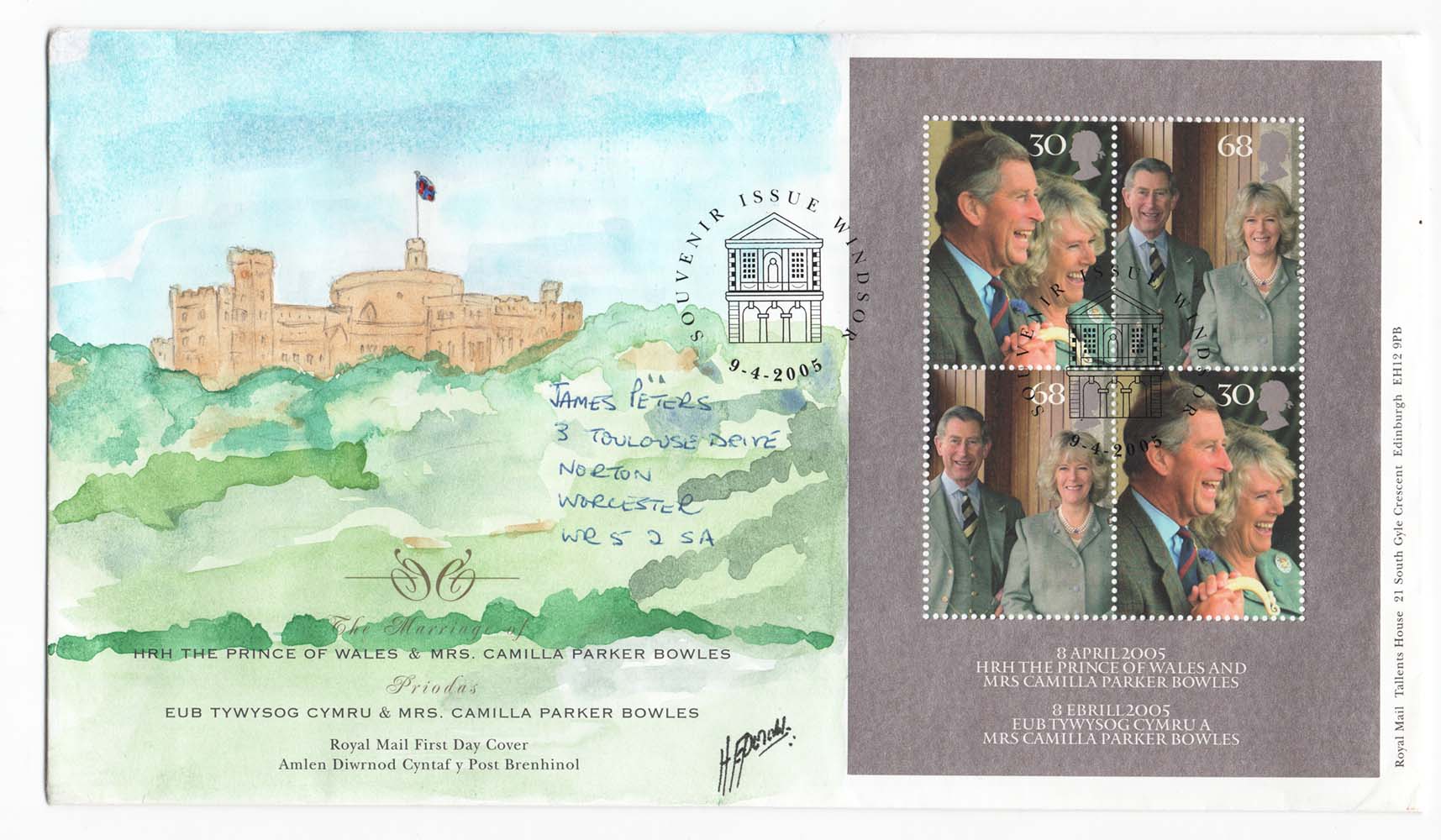 GB 2005 Royal Wedding m/sheet FDC neat h/addr, delightful hand illustrated watercolour cover, signed by artist HE Peters (1 of 2 only) [ref 288/b84a/9w0501] Elizabeth II