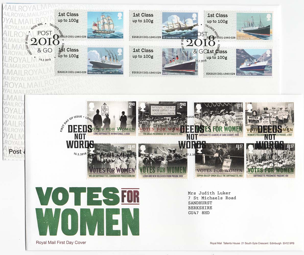 GB 2018 Mail by Sea Post&Go set of 6x1st & Votes for Women FDCs