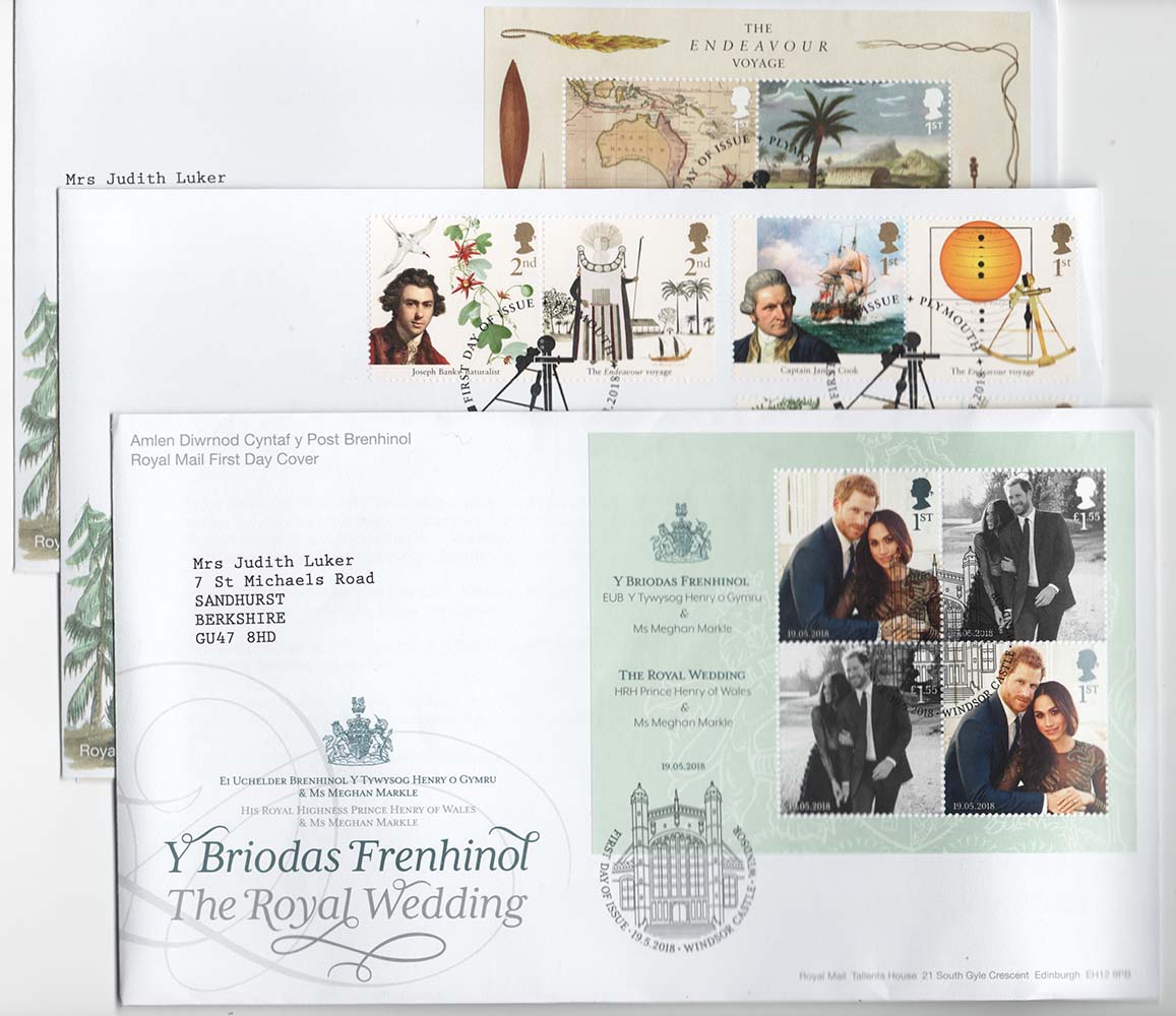 GB 2018 Royal Wedding m/sheet, Capt Cook set & m/sheet FDCs [3] [ref 287bb1643/s/9y0632]