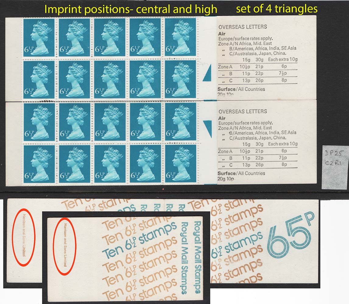 GB Booklets – Folded (good perfs) FC1B 65p RM, triangle book, imprint ‘1’, plated as col2 r1 and r10 good perfs, ditto imprint ‘2’ [ref 287bb1749/sa/9q0026]
