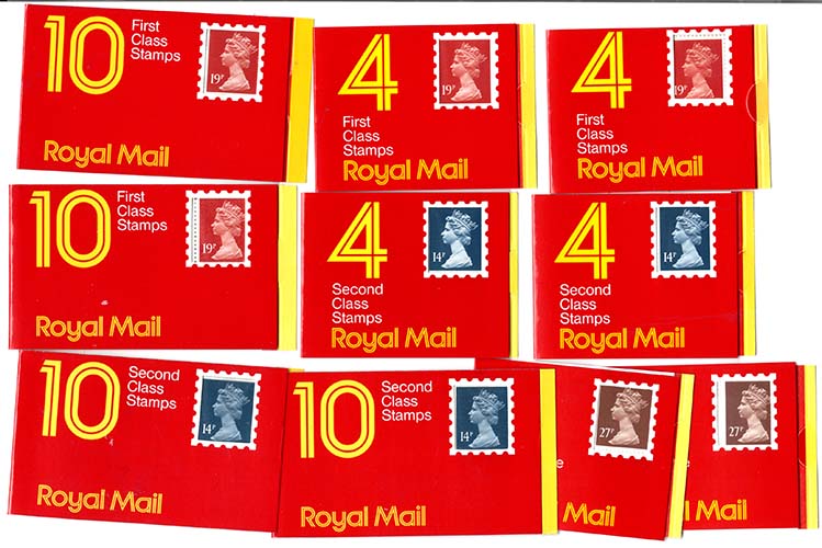 GB Booklets – Window GB1, etc set of 10 Harrison books: 4x 14p, 4x 19p, 4x 27p,10x 14p, 10x 19p, with both ref codes K-T [ref 287bb1779/bbk21/9a0416]