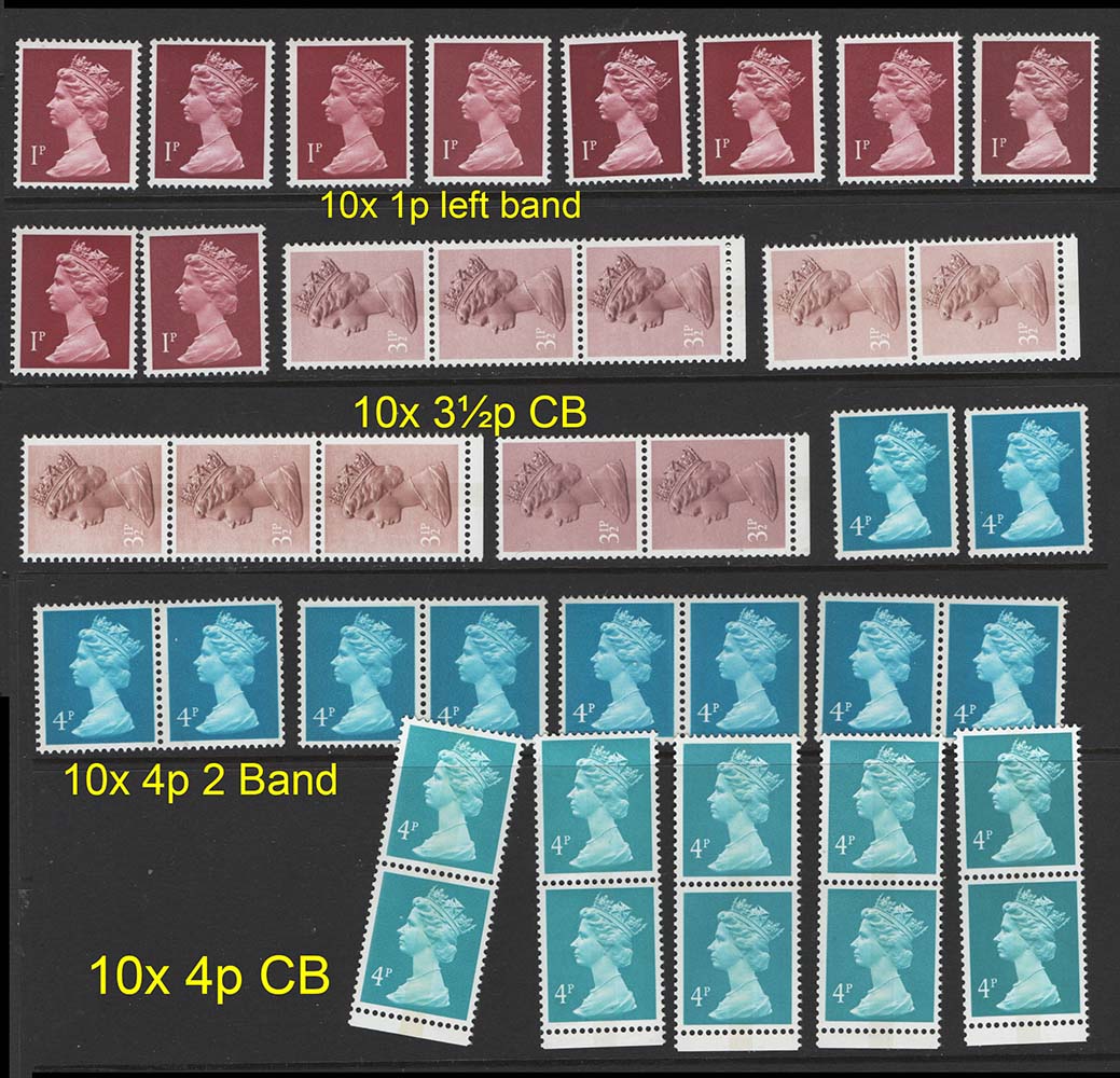 GB Difficult Machins to tuck away 10 of each: 1p LB, 3½p purple-brown CB, 4p blue 2B & CB um