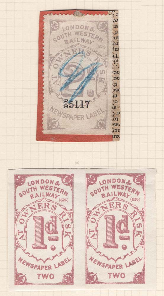 GB Railway London & South Western Railway : 2d Newspaper label used on piece, also imperf pair of 1d