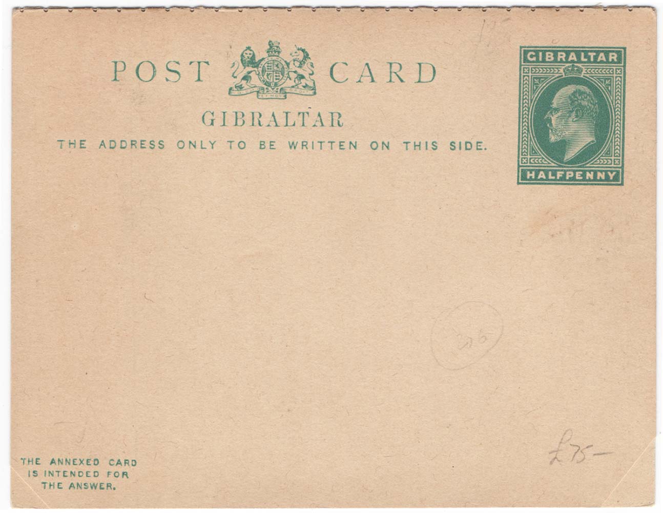 Gibraltar 1904 Reply card ½d + ½d dark green on cream, 114x89mm, v fine unused [ref 287bb1860/bstr/9w1084]