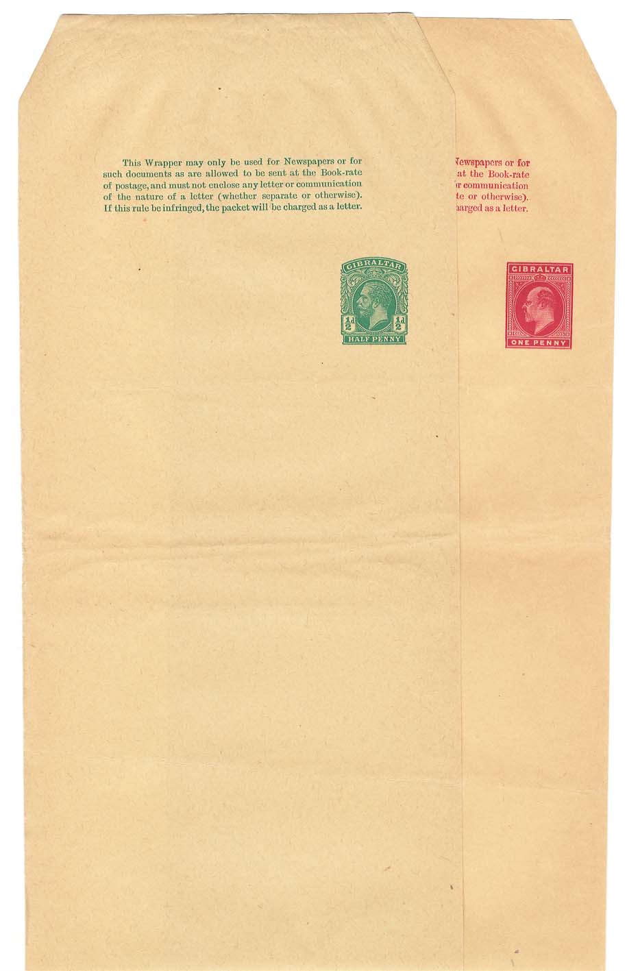 Gibraltar 1912 ½d KG5 & 1d KE7 wrappers unused minor bend HG11-12 [ref: 292/701 l/2w0148]