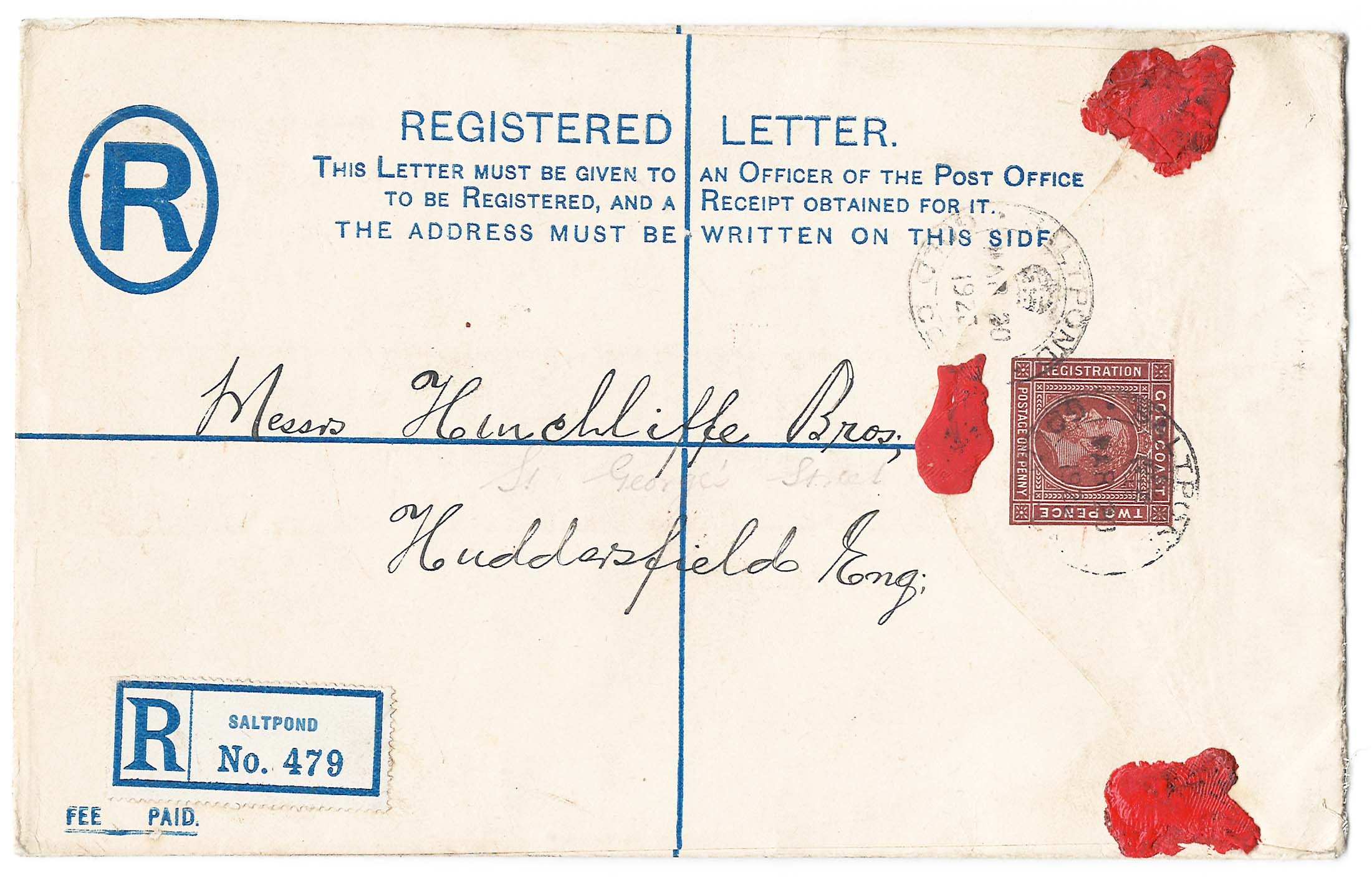 Gold Coast 1912 2d + 1d brown on white reg envelope fine used Saltpond to Huddersfield 126x201mm [ref: 292/709 l/7s0206]