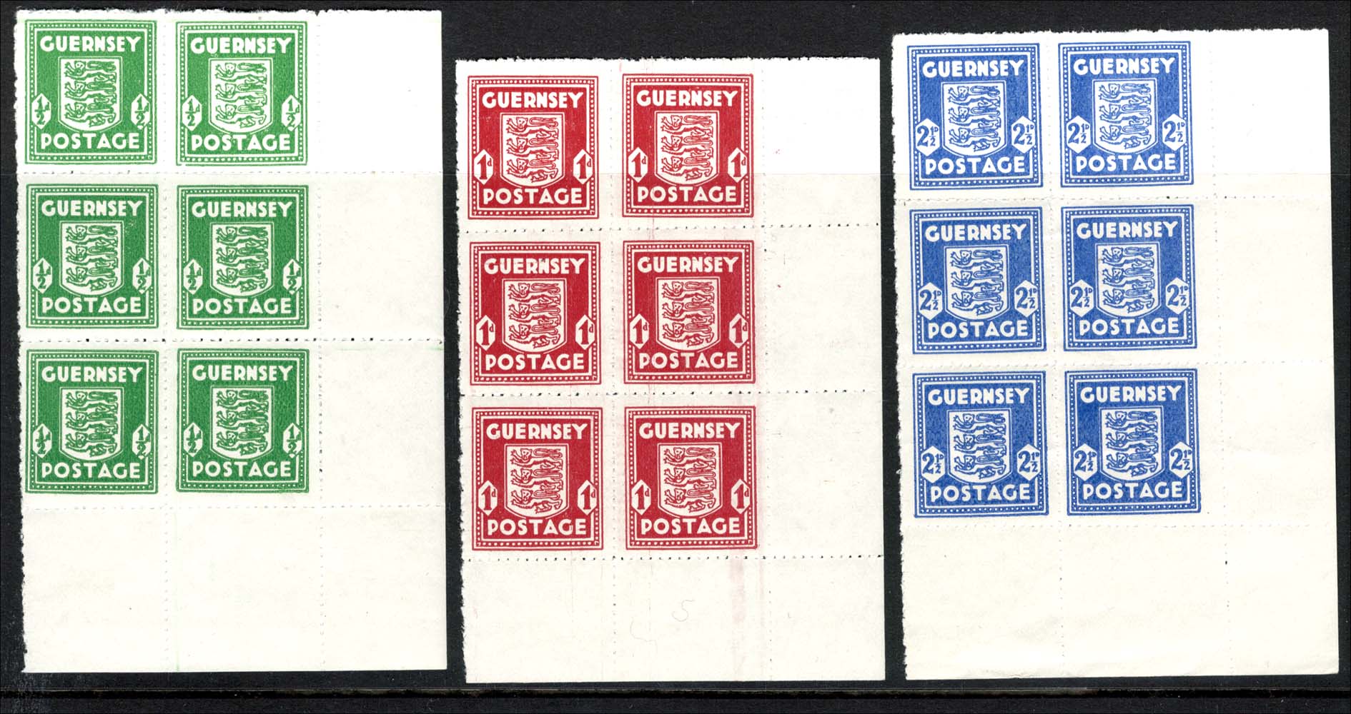 Guernsey 1941 Arms set of 3, ½d – 2½d in um corner blks of 6 c£147