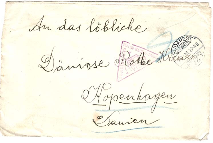 Hungary 1917 Stampless censored cover to Copenhagen, Budapest cds, triangular violet censor mark [ref: 292/734 sD/9c0801]
