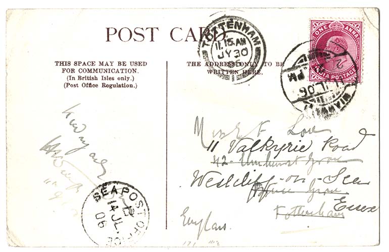 India 1906 Neat PPC to UK franked KE7 1a, fine Seapost Office cds [ref: 292/744 sa/9c0135]