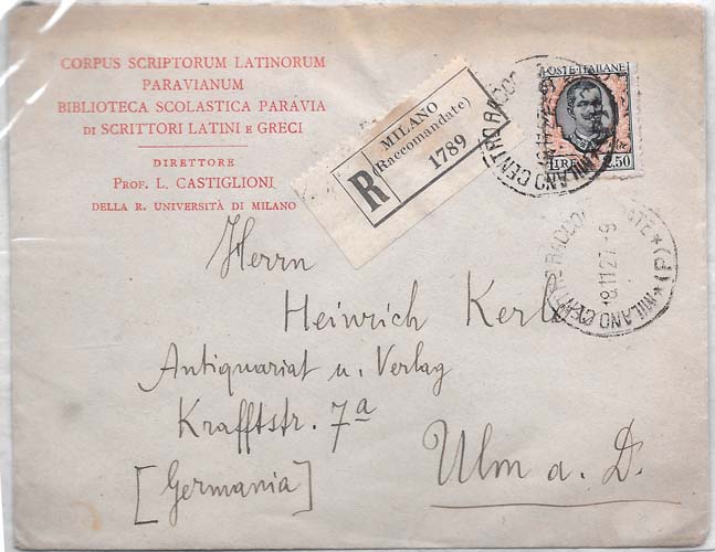 Italy 1927 Neat reg cover Milan to Germany franked 2L50 [ref: 292/776 sD/8i0722]