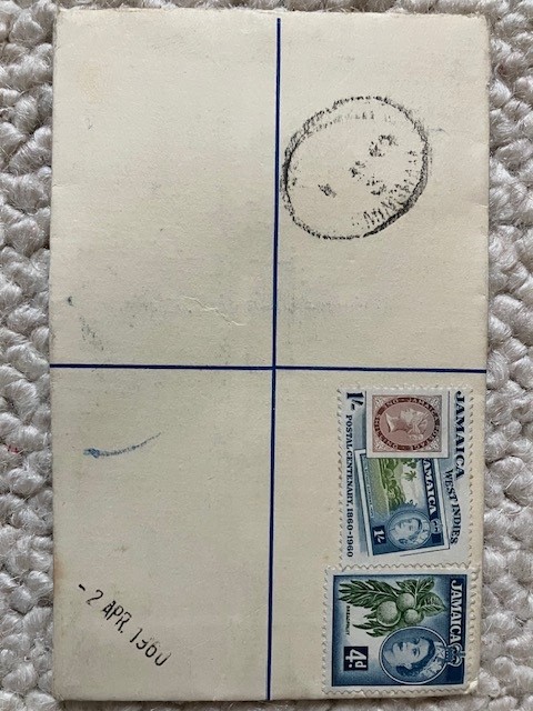 Jamaica 1960 2d registered envelope fine used to UK uprated 1/4d on back (uncancelled)