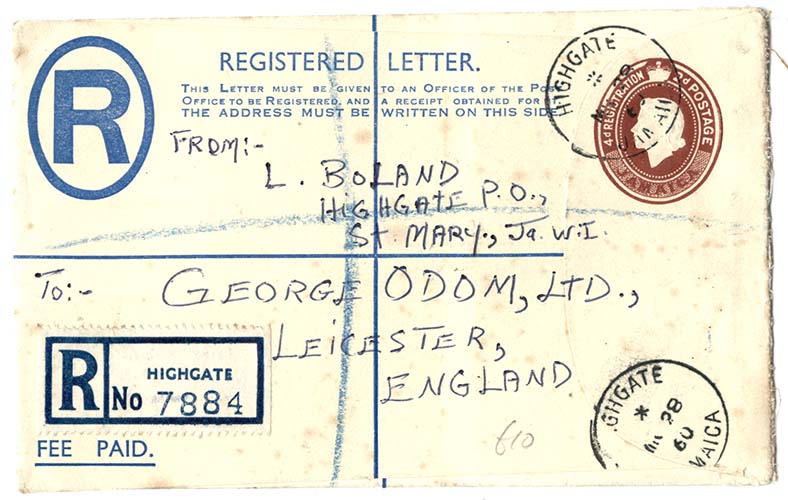 Jamaica 1960 2d registered envelope fine used from Highgate, St Mary to Leicester UK uprated 1/4d on back (uncancelled). ref(273/2381/9e0481/sajr) [ref: 292/800 sa/9e0481]