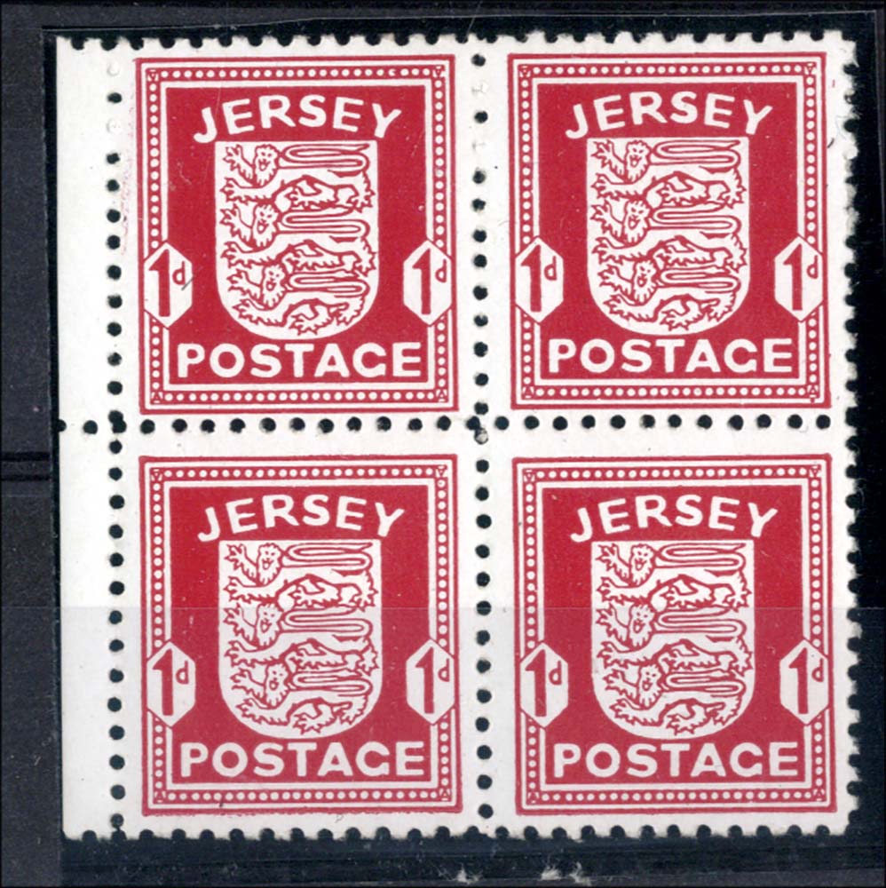 Jersey 1941 Arms 1d chalky paper um blk of 4 c£220 [ref 287bb1958/sae/9k0416]
