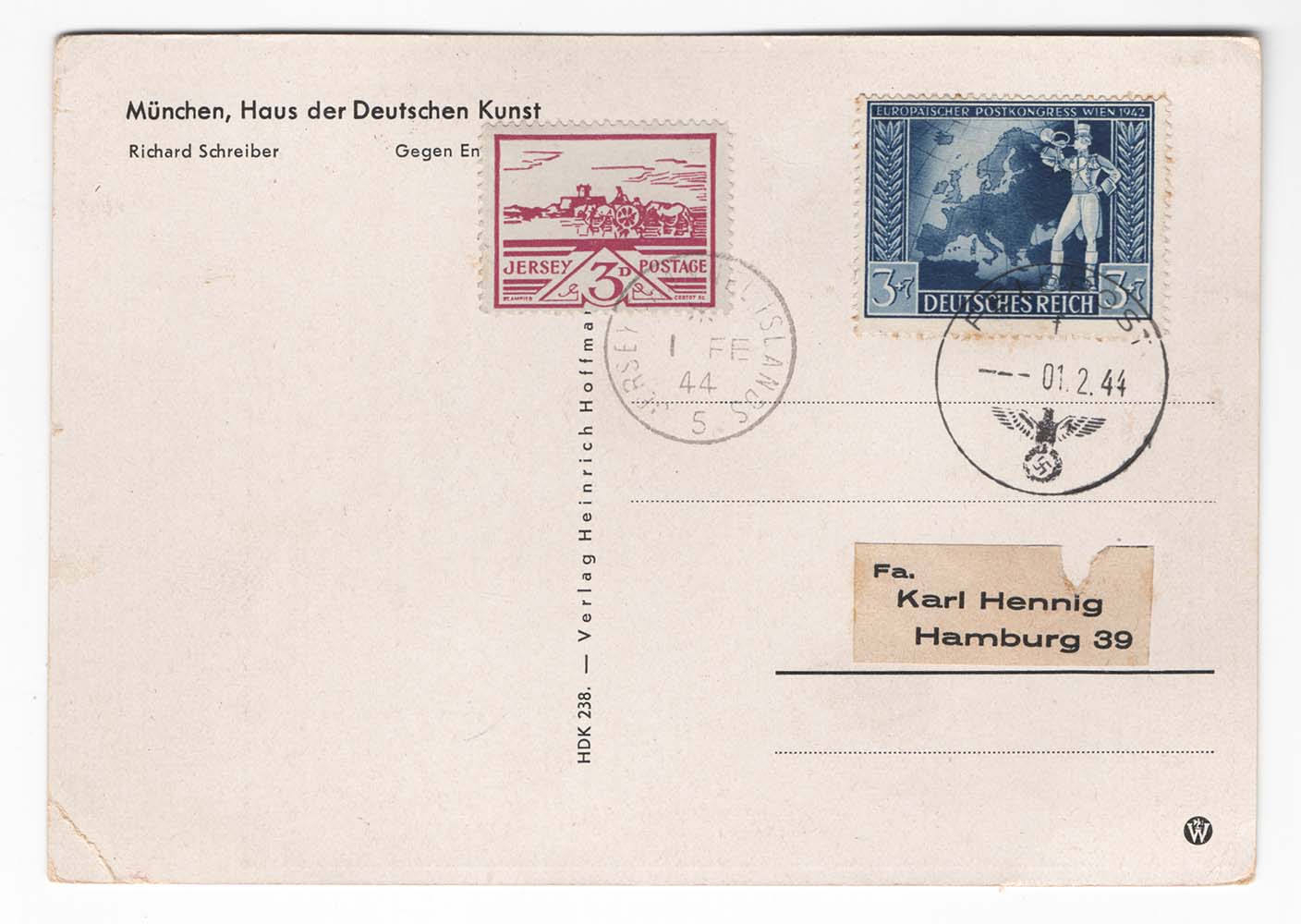 Postcard to Hamburg with German stamp with Feldpost cancel & 3d Views Jersey cds same date – unusual