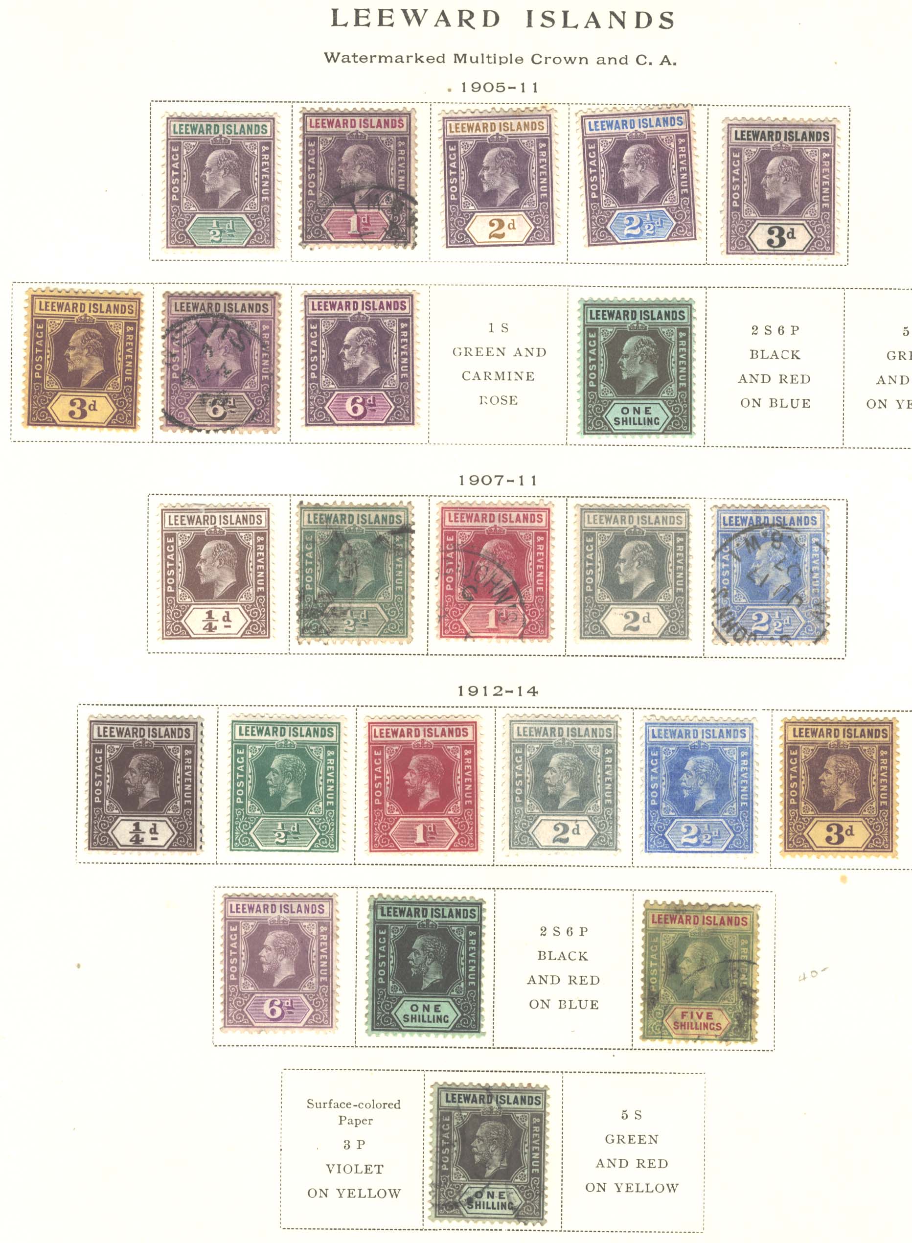 Leeward Is 1905-12 m&u range incl 1905 6d, 1s fine mint, 1912 ½d – 1s fine mint, 5s good used, 1s white back good used cat £400+ [ref: 292/828 b07/9e0894]