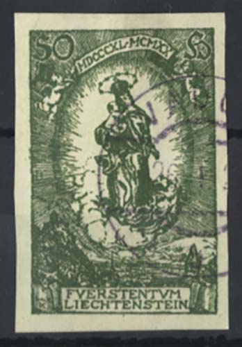 Liechtenstein 1920 Madonna 50h imperf sg438 fine used, Vaduz cds, offered ‘as is’ cat £1300 8s0199 273sa Europe [ref: 292/831 saD/8s0199]