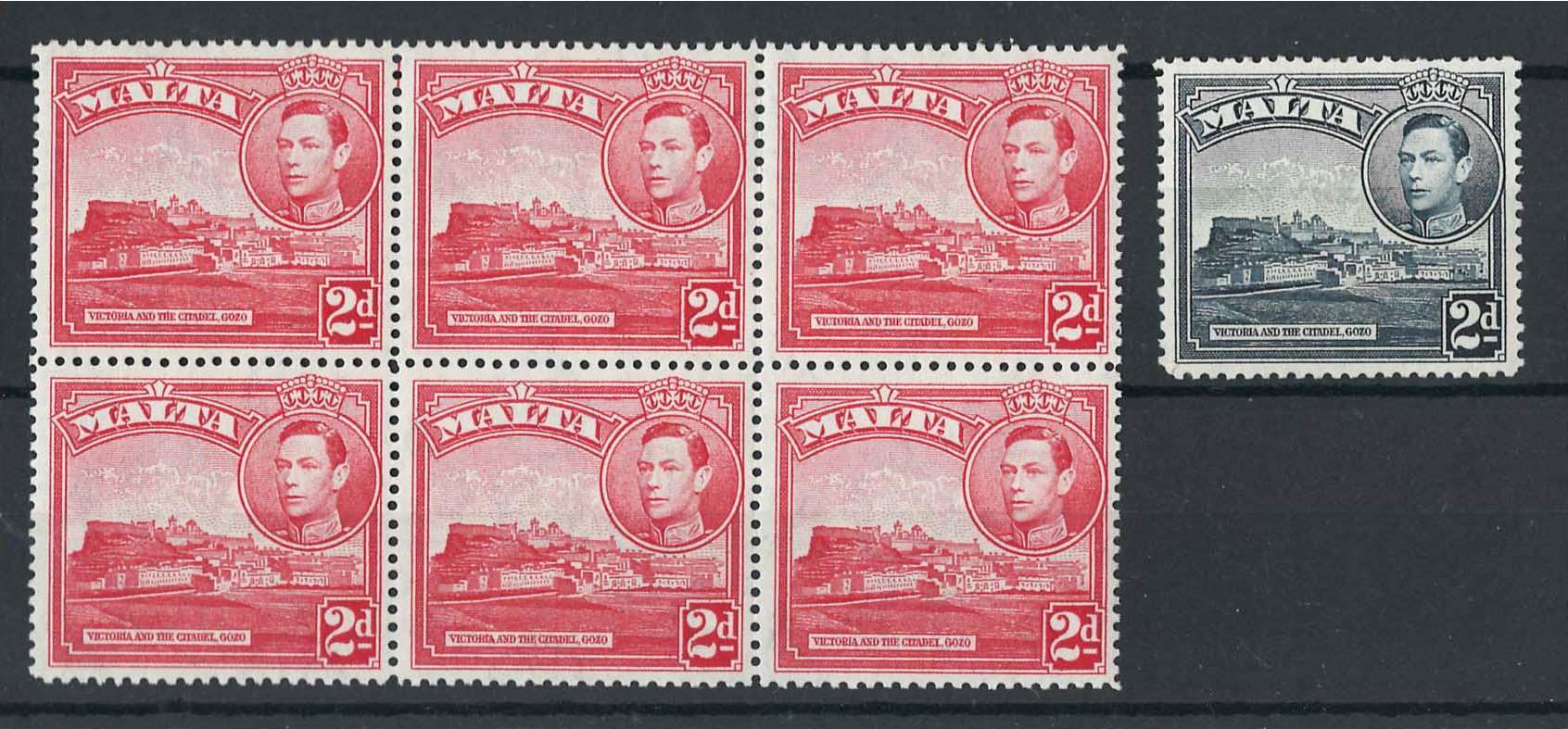 Malta 1938 2d scarlet sg221ba extra windows variety um blk of 6, ditto 2d single f mint c£200