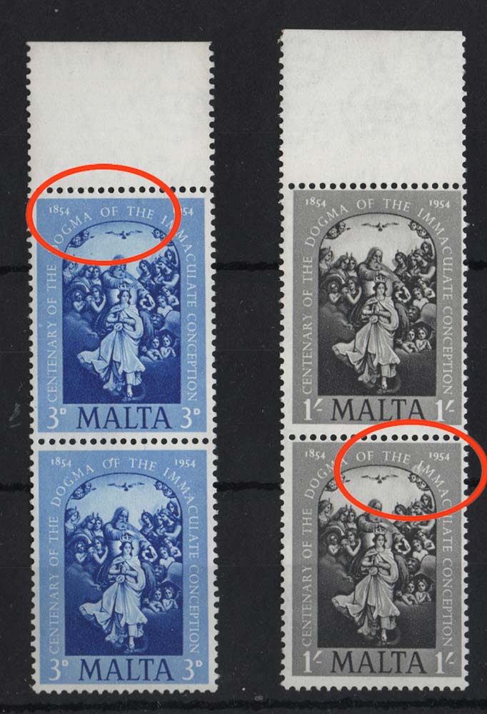 Malta 1954 Centenary of Dogma 3d r2/7 blob on O in OF, 1s r2/4 large retouch by I of Immaculate sg264-5 um, SG Varieties Cat 1980 V7, V1