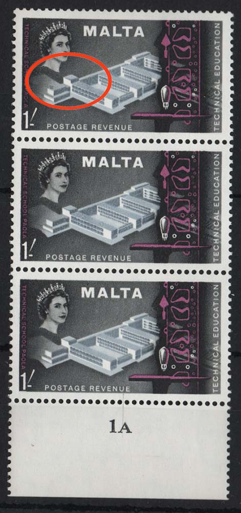 Malta 1958 Technical Education 1s sg288 r8/5 retouch on building um positional strip of 3, SG Varieties Cat 1980 V9