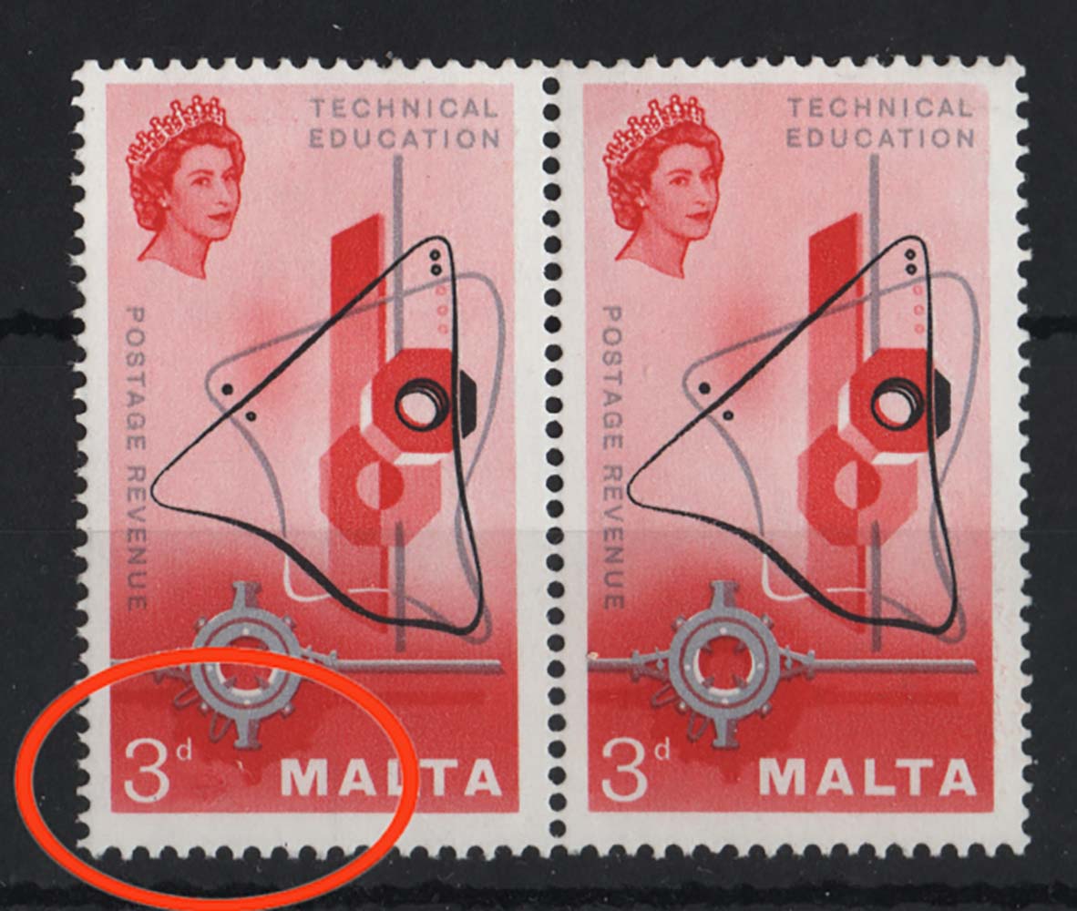 Malta 1958 Technical Education 3d sg287 r6/1 large retouch to right of value um, SG Varieties Cat 1980 V20