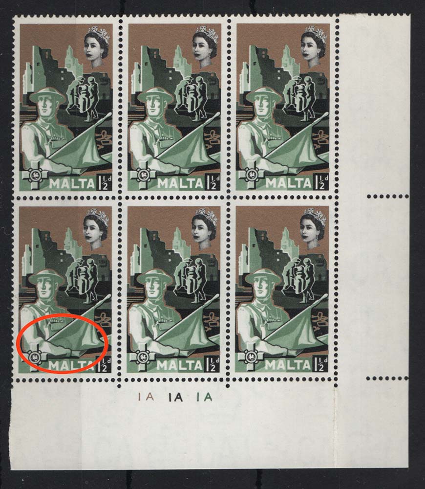 Malta 1959 George Cross 1½d sg292 r6/8 large retouch on stretched um plate blk of 6, SG Varieties Cat 1980 V12