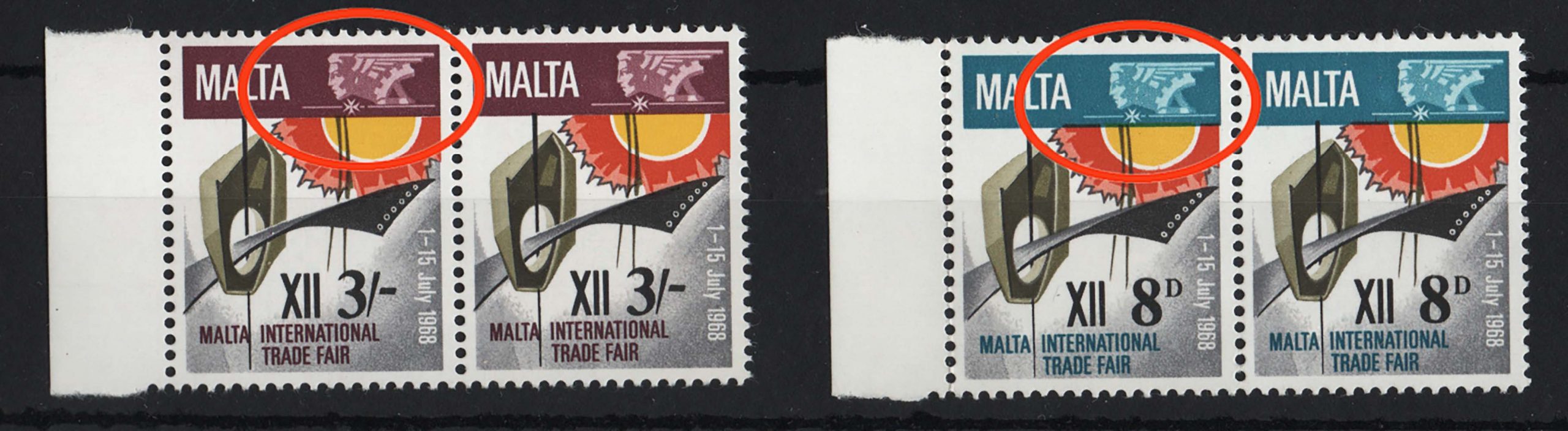 Malta 1968 International Trade Fair 8d & 3s sg403-4 r5/1 broken line right of MX um corner pair, SG Varieties Cat 1980 V28