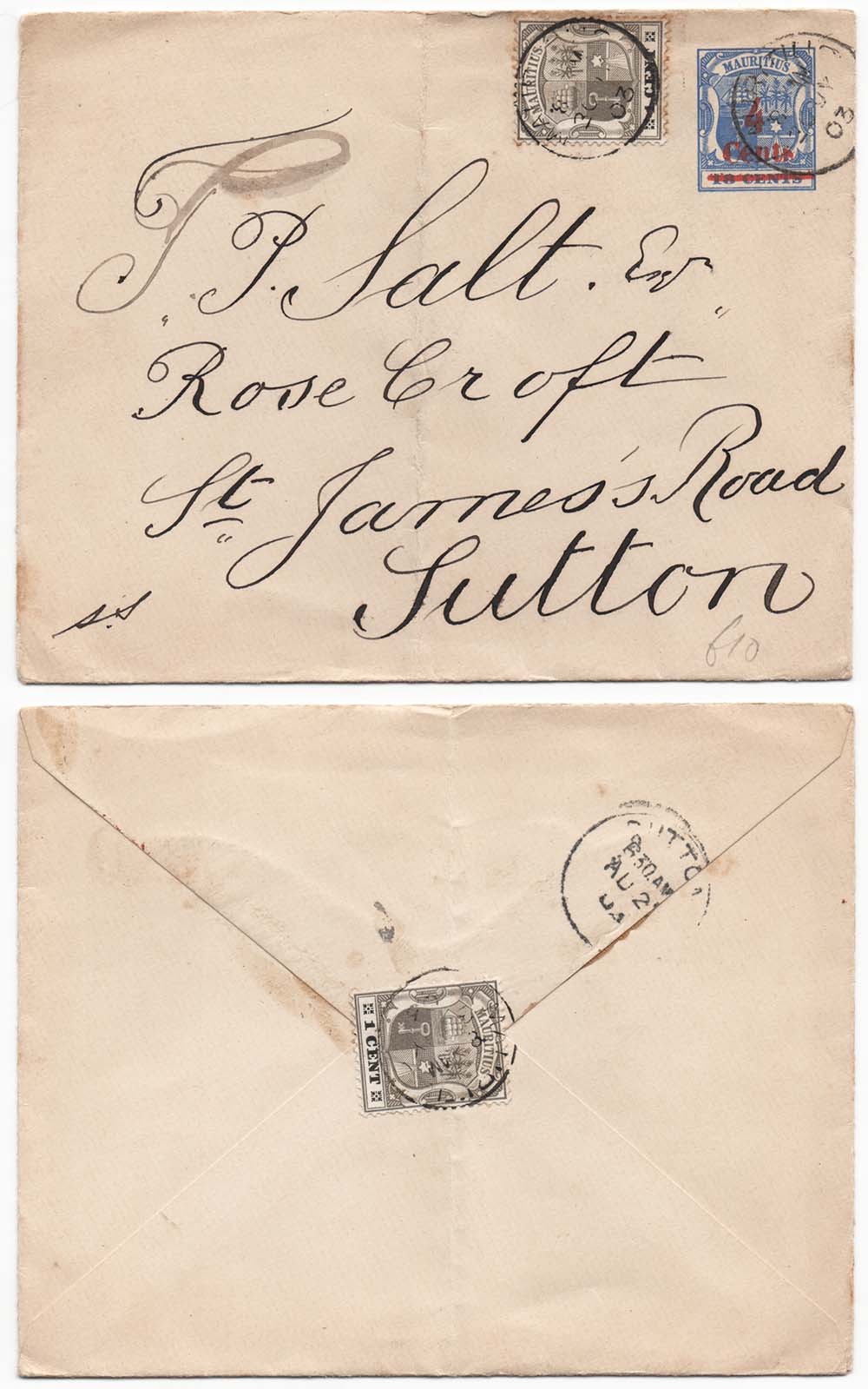 Mauritius 1903 4c on 18c Postal Envelope uprated 2x 1c, one used as a seal, to Sutton, Surrey fu [ref 287bb2087/se/6e2079]