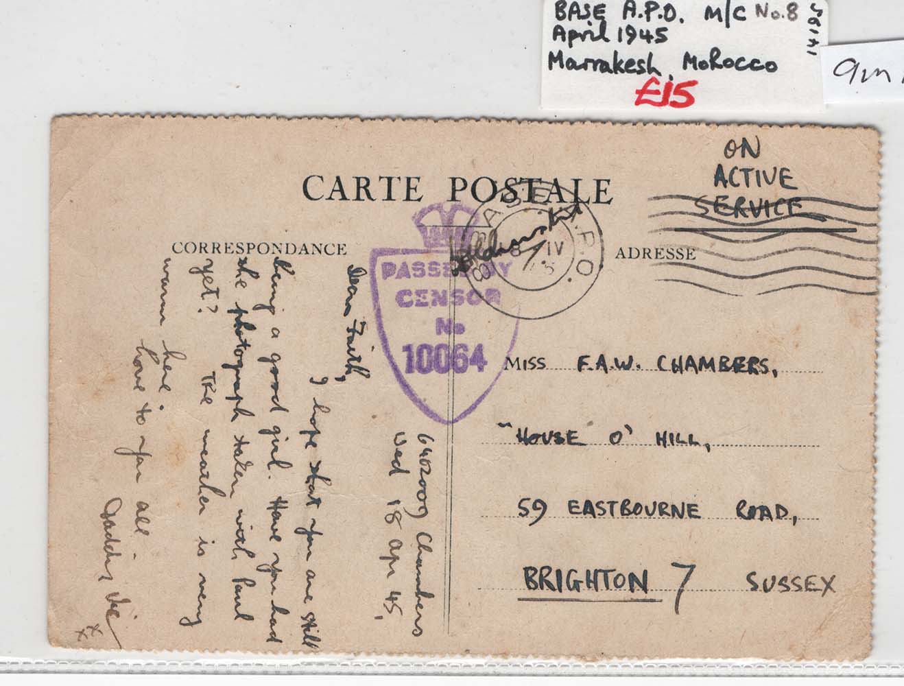Military-WW2 1945 Military Post Postcard from 8 Base APO, Morocco to Brighton, GB 06Apr45 [ref 287bb2107/bph1/9m1062]