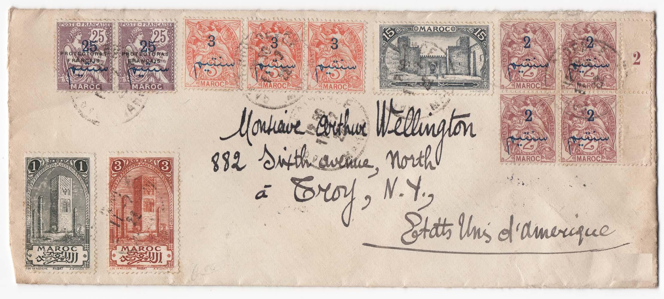 Morocco 1922 Neat cover to USA franked with 12x French Morocco incl 9 ovpts