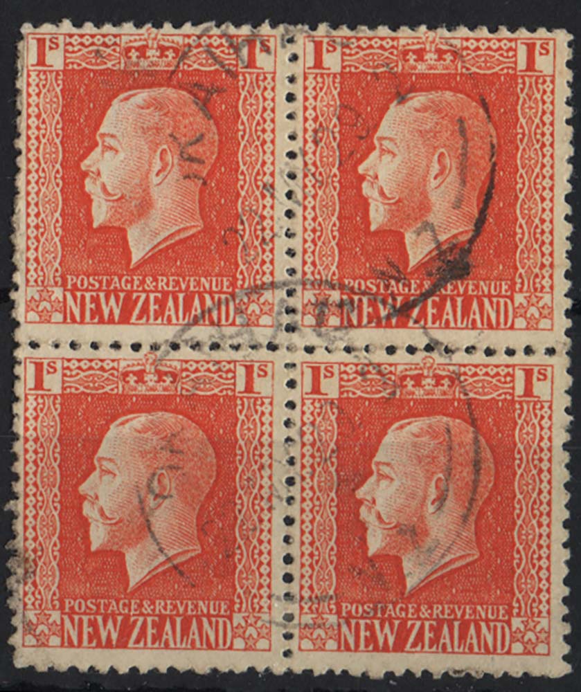 New Zealand 1915 1s pale orange-red p14x14½ sg430ca vfu blk of 4 c£100 as singles