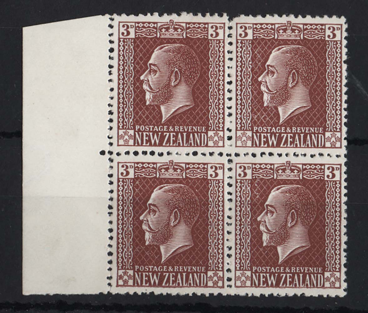 New Zealand 1915 3d chocolate Jones paper p14x15 CPK19b(1) sg443var f mint blk of 4 c£120 [ref 287bb2156/sa/9y0115]