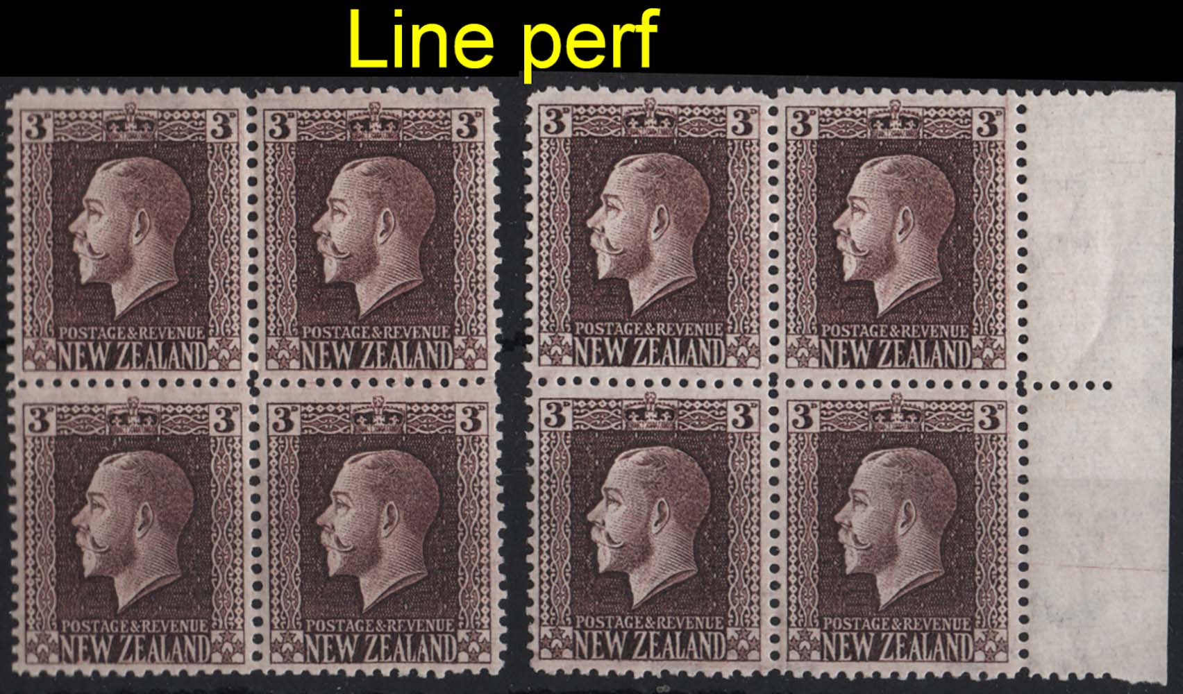 New Zealand 1915 3d chocolate wmk sideways line perf 14 um blk of 4 sg433, ditto in deeper shade c£60 as mm [ref 287bb2153/sa/9y0092]