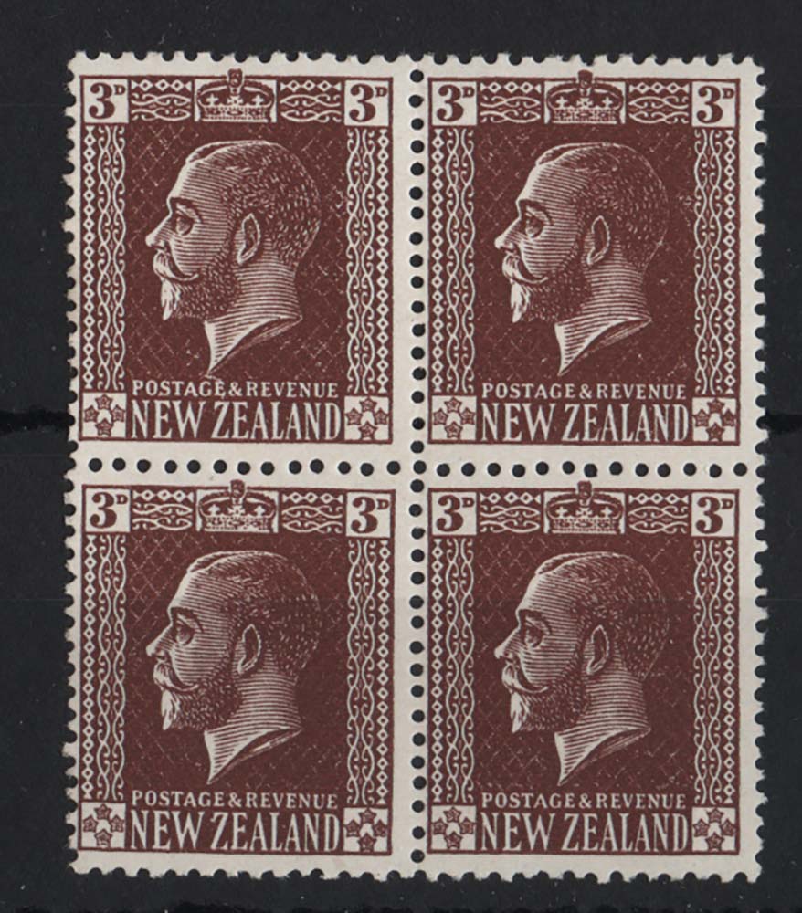 New Zealand 1915 3d deep chocolate Jones paper p14x15 sg443 um blk of 4 c£120 as mm [ref 287bb2155/sa/9y0114]