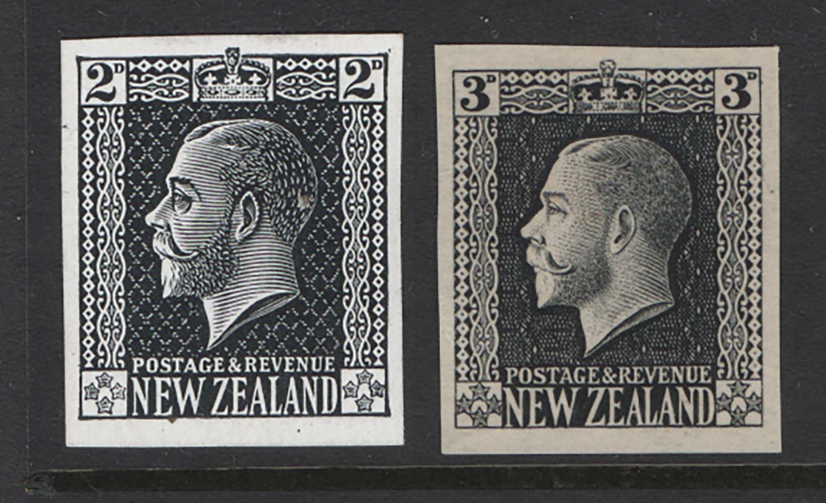 New Zealand 1921 KGV head 2d (horiz shading) fine imperf proof in black on thick paper, ditto 3d diagonal shading on thin paper [ref 287bb2165/sa/9y0580]