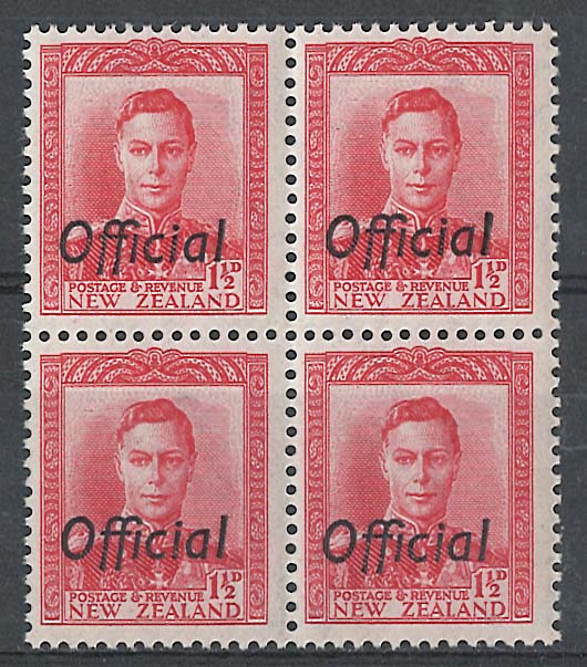 New Zealand 1938 1½d scarlet Official sgO139 unmounted mint block of 4 cat £48 [ref: 292/920 saE/4s2110]
