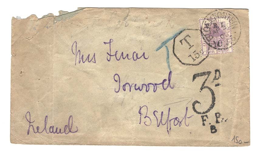 Orange Free State 1900 Underpaid cover to Belfast franked VRI 1d ovpt, T15c & 3d FPB markings, roughly opened 8w0083 273sa