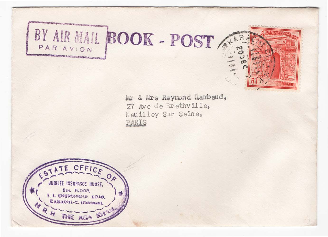 Pakistan 1972 Neat book post cover to Paris franked 1r, fine ‘Estate Office of HRH Aga Khan’ cachet